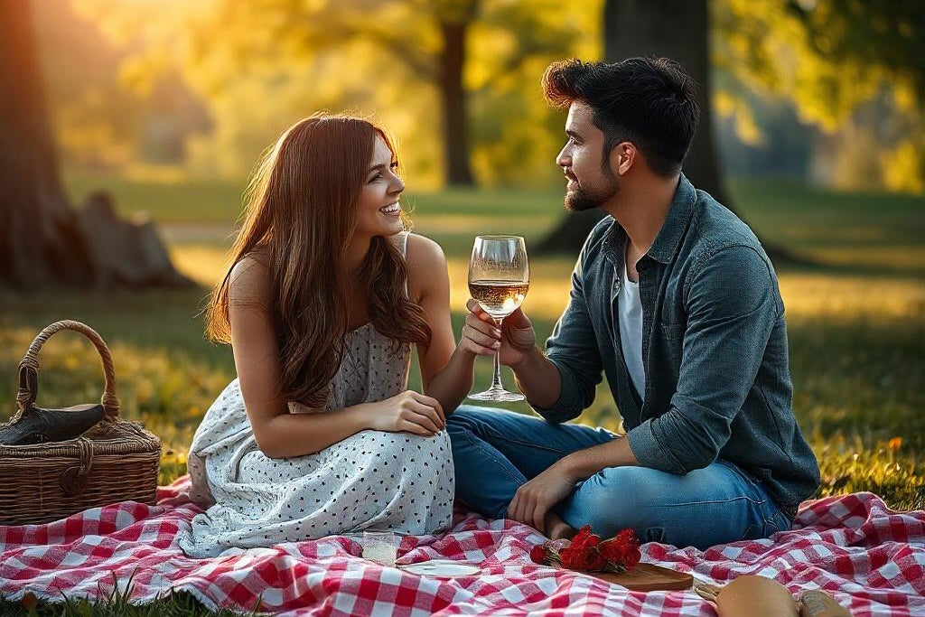 VaiUn momento di fuga dalla routine, immersi nella natura in un parco o in un prato verde. Una coperta stesa sull'erba, un cestino da picnic con prelibatezze come frutta, formaggi e pane fresco, e due persone che brindano con un calice di vino bianco. Circondati dal canto degli uccelli e dal profumo dei fiori selvatici, è l'occasione ideale per rilassarsi e godere della compagnia del proprio partner in un contesto tranquillo e romantico.